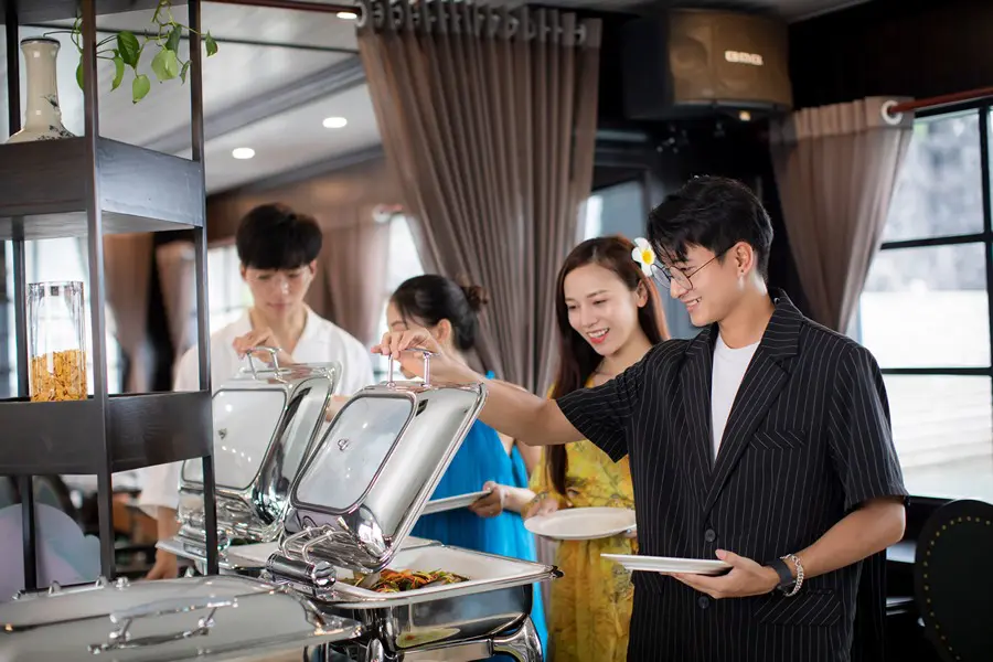 Nhà hàng trên boong tàu là nơi 36 thực khách có thể thưởng thức những món ăn đặc sắc được chế biến bởi đội ngũ đầu bếp tài hoa. Dọc hai bên thân tàu, những góc café và trà chiều xinh xắn mở ra tầm nhìn panorama ôm trọn vịnh biển. Đặc biệt, sundeck tầng 2 là “thiên đường” thư giãn nơi du khách có thể đắm mình trong không gian mộng mơ của di sản.
